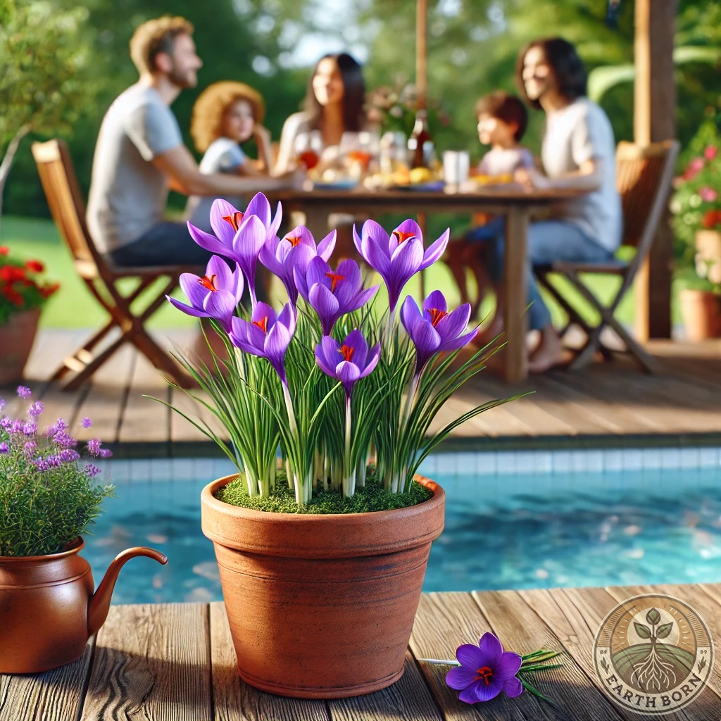 Saffron prefers its own space but can grow near other low-water herbs like thyme and rosemary.